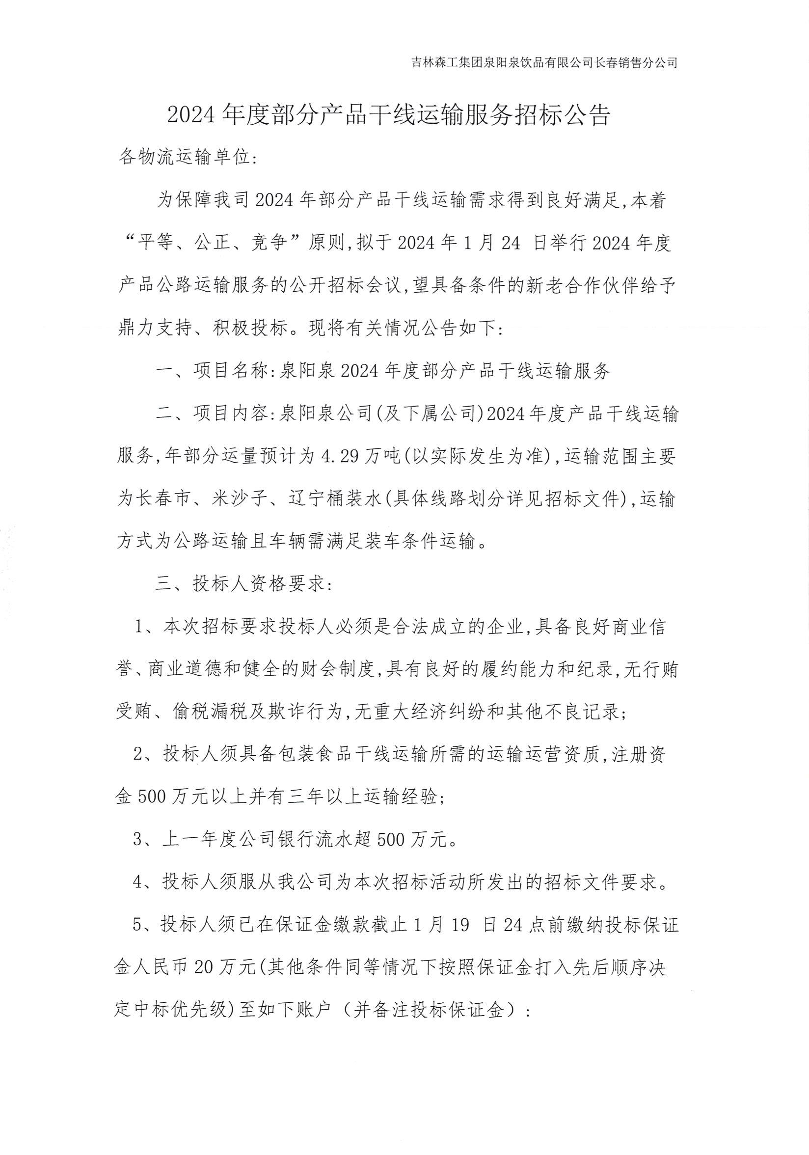 2024年度部分產(chǎn)品干線運輸服務招標公告